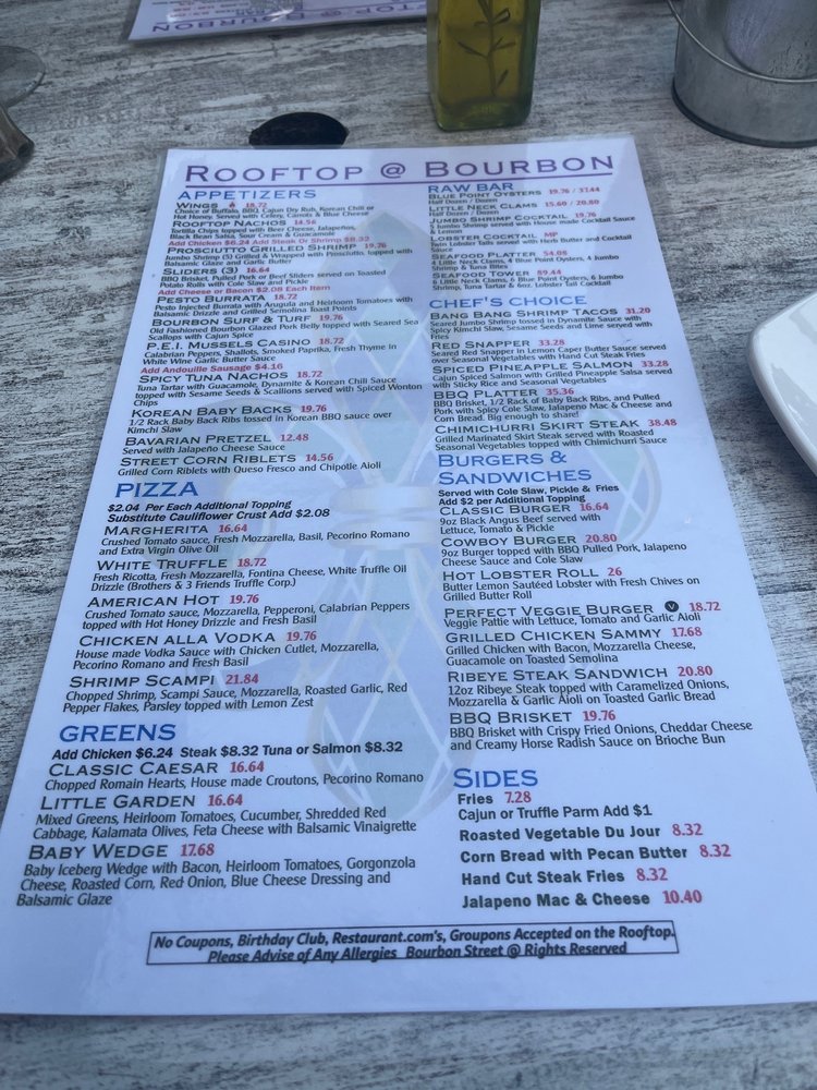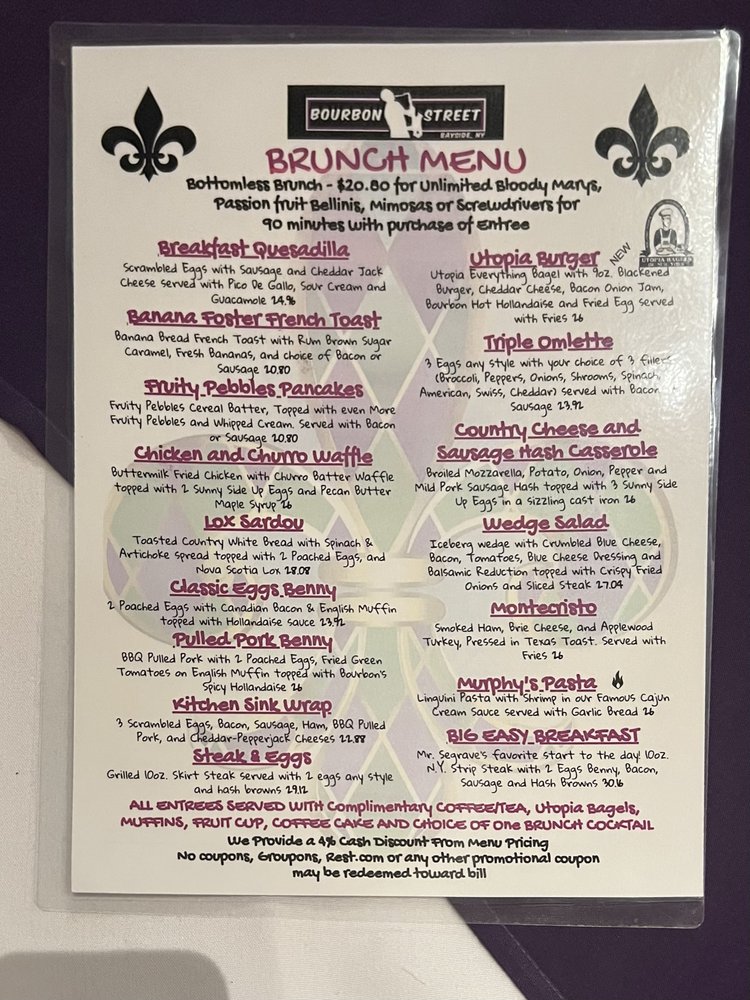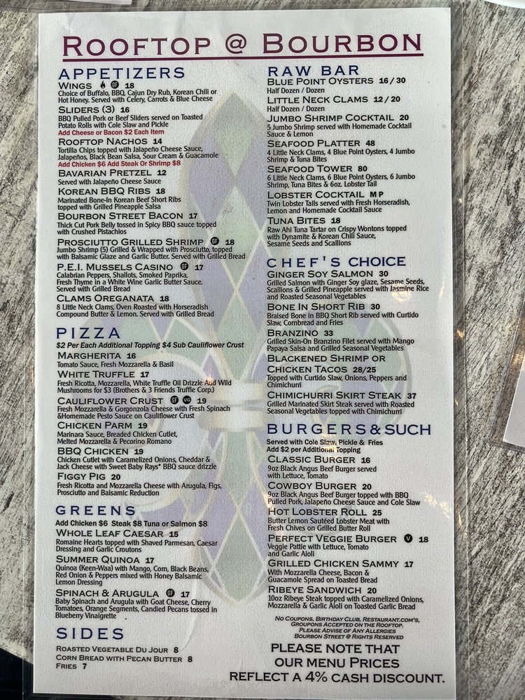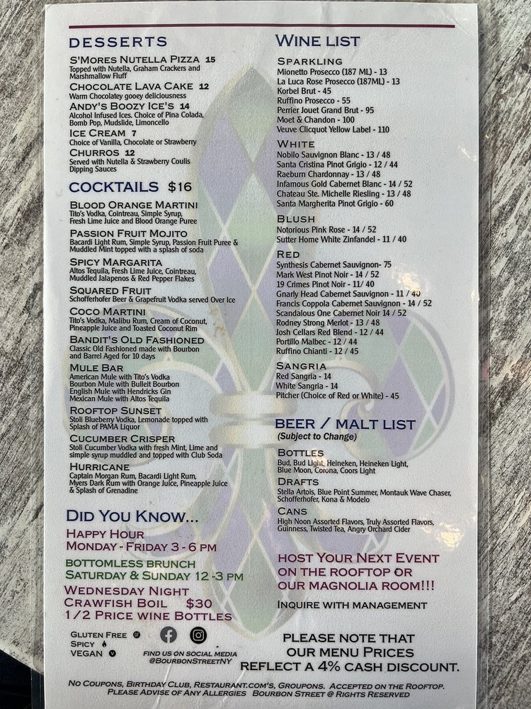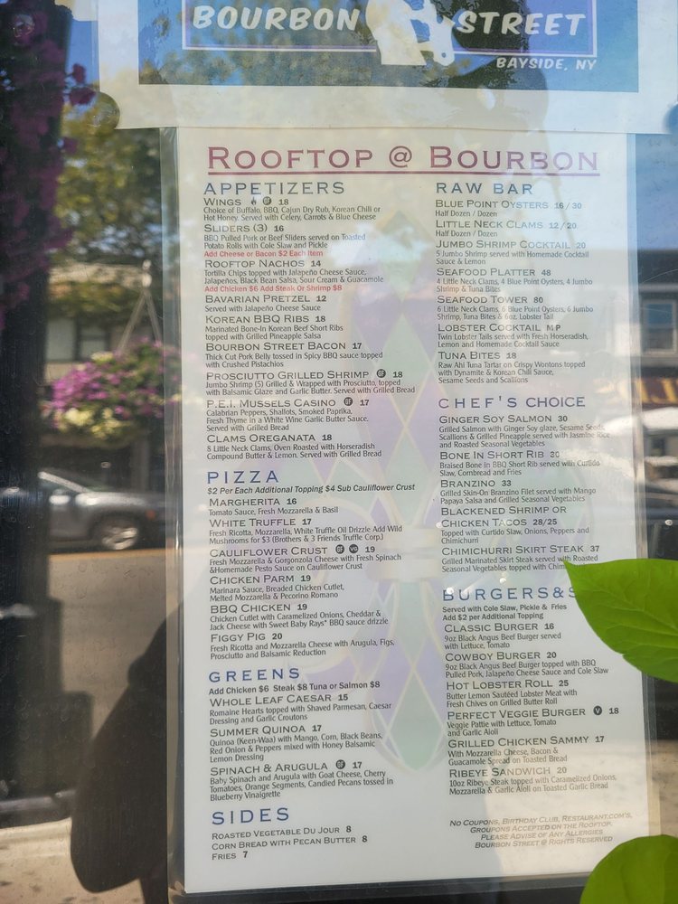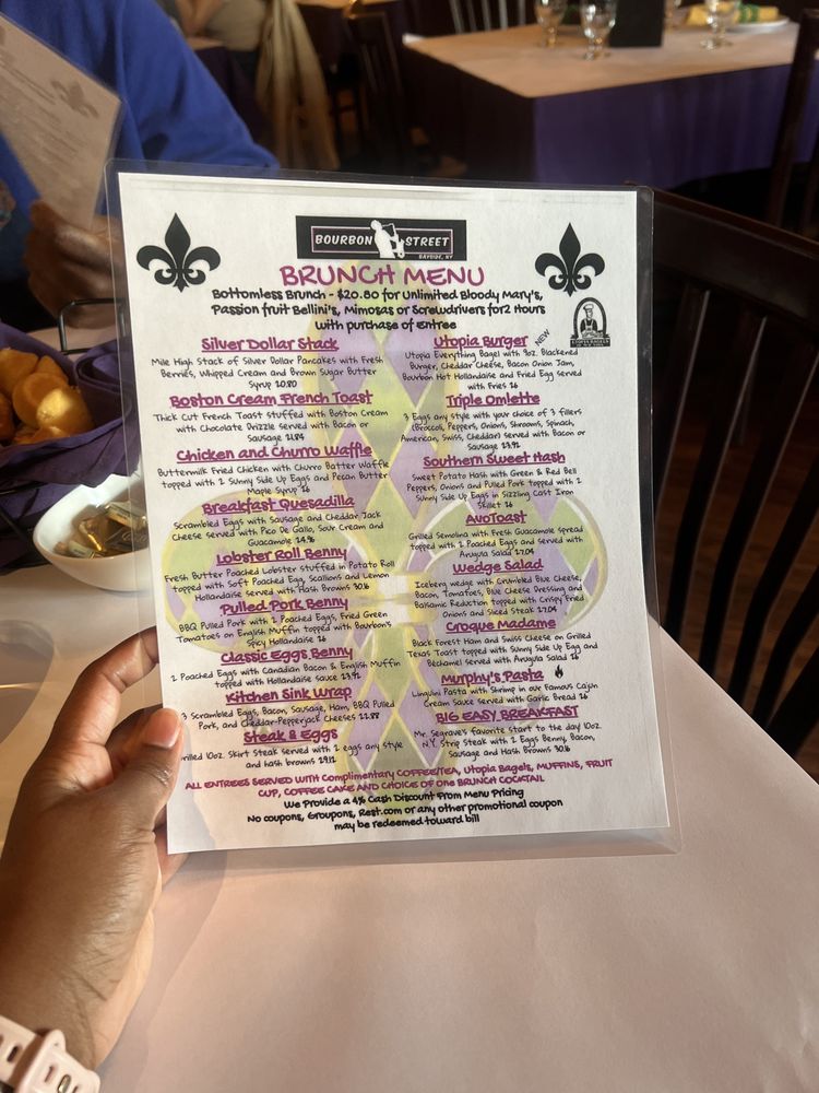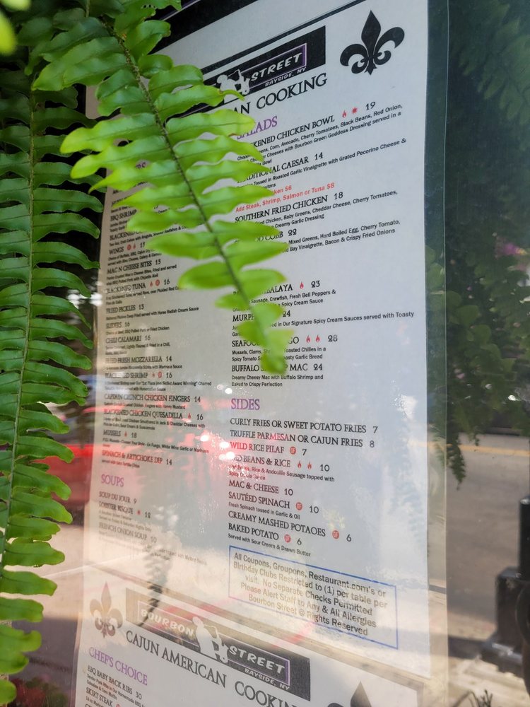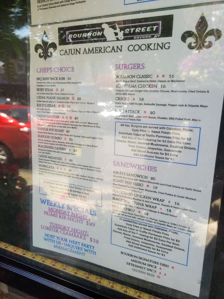 "Introducing the menu at Bourbon Street in Queens, NY, a Cajun/Creole gem with a New American twist. This restaurant offers a variety of options including vegan and vegetarian dishes. From fried mac and cheese balls with pulled pork to a creative taco salad and a flavorful Creole burger, the menu is filled with decadent and tasty choices. Customer reviews praise the friendly service, delicious food, and vibrant atmosphere reminiscent of New Orleans. The ribs and jambalaya are highlighted as must-try dishes that burst with authentic flavors. With a rooftop space for special events, Bourbon Street offers a unique dining experience with a jazzy yet comforting feel. The restaurant also provides happy hour specials, live music, and a diverse selection of beer, wine, and spirits. Overall, Bourbon Street is a must-visit for anyone craving a true taste of Cajun/Creole cuisine."